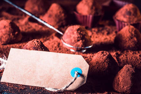 Chocolate truffles and sale tag, macro. delicious homemade truffle with dark chocolate and cocoa powder.