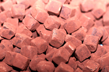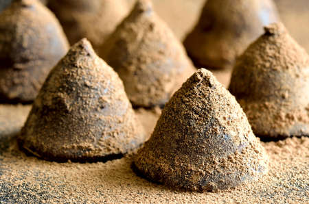 Chocolate balls with cocoa powder on broun background