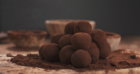 Homemade dark chocolate truffles on wooden background. Heap of cocoa covered chocolate truffles