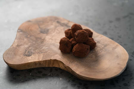 Handmade chocolate truffles on olive wwod board