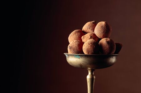 Chocolate truffles in old brass vase sprinkled with cocoa powder. Copy space.
