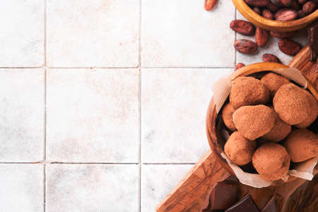 Chocolate truffles with cocoa powder in wooden dish on old cracked tile table background. Tasty sweet chocolate truffles candies. Valentine's Day and Mother's Day concept with copy space. top view.