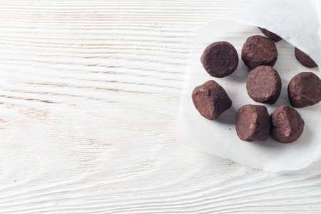 Chocolate truffle candies in the paper packing on the white wooden table horizontal
