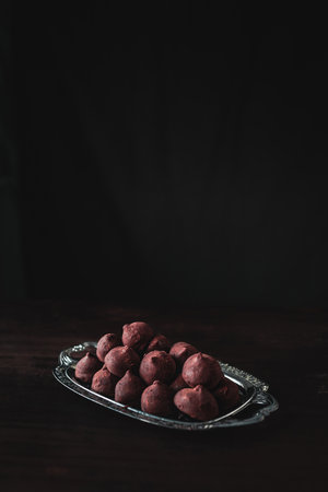 A refined low-key photograph showscasing a silver tray filled with rich chocolate truffles, with dramatic shadows and minimal lighting that highlight the luxurious texture and depth of the scene