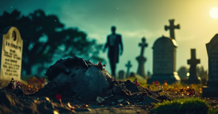 abstract creepy, an open coffin in a cemetery with a creature or figure whose bones serve as remains, horror and halloween