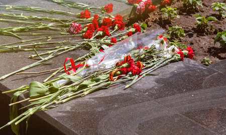 Victory Day fresh flowers close up. Flowers on granite monument. Symbol of patriotism and sorrow.