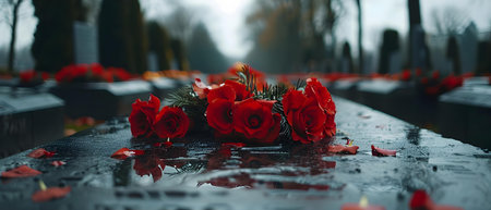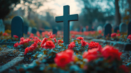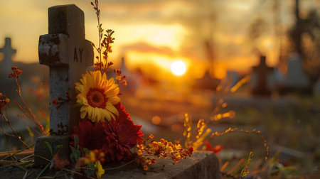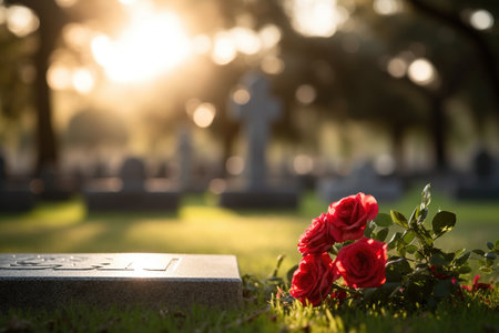 Tombstone Adorned with Red Flowers at Sunset, Evoking Themes of Remembrance and Loss.