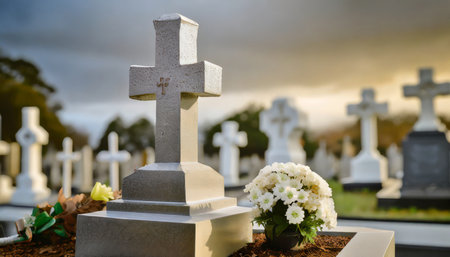 Colorful flowers are tastefully arranged around a grave in a serene cemetery. Soft sunlight filters through the trees, creating a peaceful atmosphere during autumn