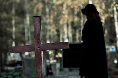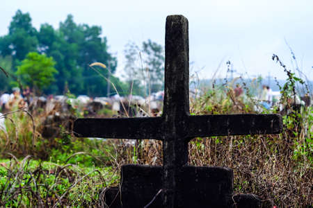 Sunset spiritual cemetery or graveyard with old grave tombstone and crosses, quiet calm prayer, sadness memorial landscape