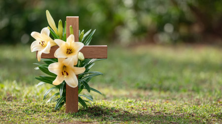 A beautiful wooden cross surrounded by soft yellow lilies, representing hope and remembrance, set in a peaceful garden atmosphere, ideal for spiritual themes.