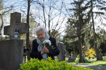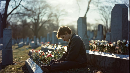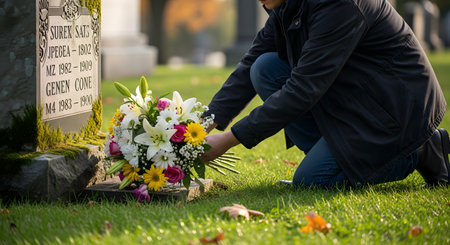 A grieving person kneels to place a fresh bouquet of flowers on a tombstone in a green cemetery. The scene depicts a moment of mourning, remembrance, and paying respects to a loved one who has passed away.