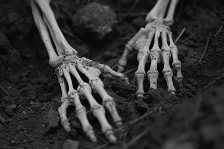 A monochrome photograph depicting two human hands, capturing their form and texture, Creepy skeleton hands reaching out from the ground, AI Generated