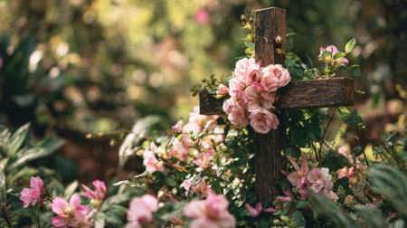 Concept photo of an Easter cross surrounded by delicate pink roses and vibrant greenery, evoking a sense of hope and rebirth