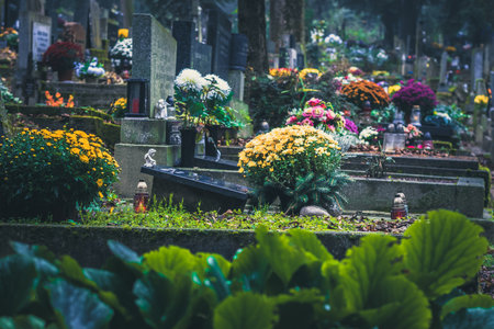 Flowers on graves in the cemetery during the All Saint's Day. Taken during the day, natual light.