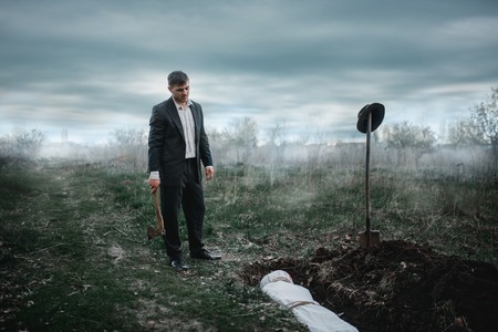 Sad man is mourning by a fresh grave, putting flowers at the cemetery
