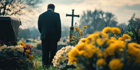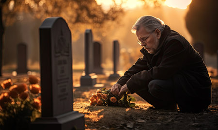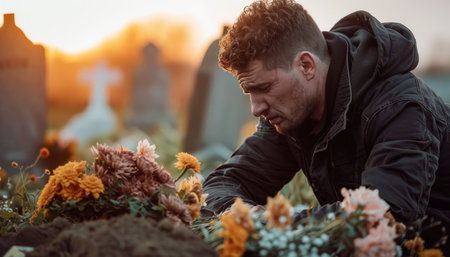 .A solemn man in a suit kneels beside a grave adorned with fresh flowers, grieving in the serene light of sunset.