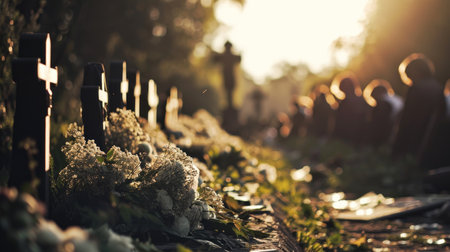 Sunlight filters through cross markers in a peaceful cemetery setting, casting a tranquil ambiance.
