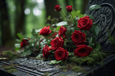 Eternal Love: Green Leaves and Red Roses on the Gravestone