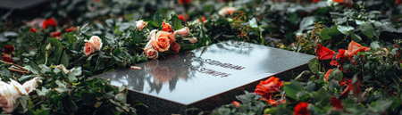 Solemn Tribute: Roses on Rain-kissed War Memorial. Concept War Memorial, Roses, Solemn Tribute, Rain-kissed, Commemoration