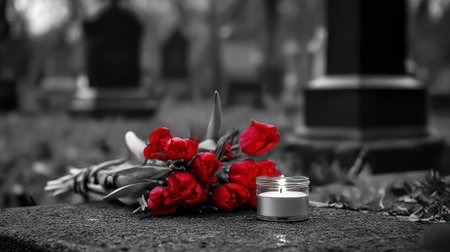 Red flowers sit on a gravestone next to a lit candle in a cemetery. The scene shows a tribute made in memory of a loved one. Trees surround the area and the atmosphere feels reflective.