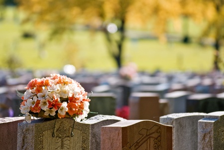 Old cemetery with tombstones and flowers, selective focus, shallow DOF.