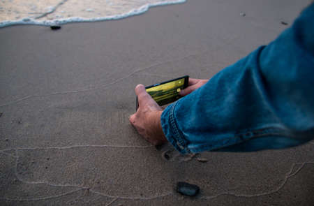 Smartphone stuck in the wet sand of the beach