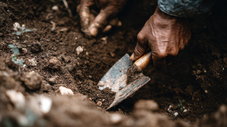 Close up of hands using small shovel to dig in rich, dark soil, showcasing texture and earthiness of gardening. scene conveys sense of connection to nature and hard work