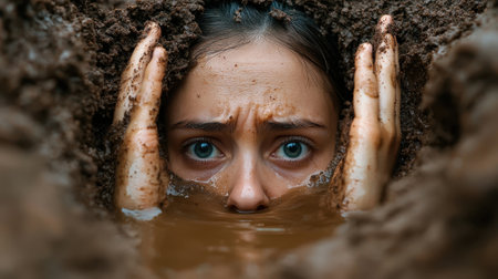 A woman is submerged in a muddy pool, her face partially visible. Concept of discomfort and unease, as the woman is struggling to breathe and is surrounded by the murky water