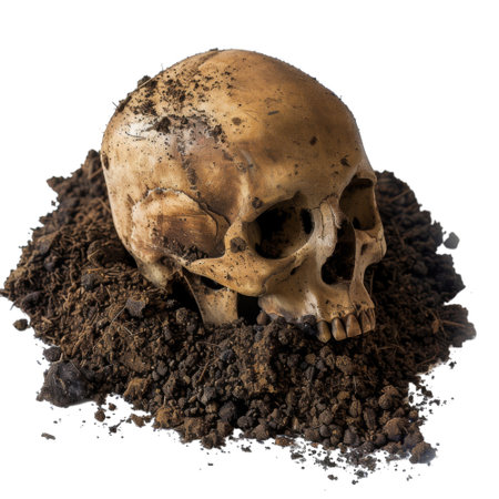 A close-up of a human skull partially submerged in loose brown dirt, against a white background.