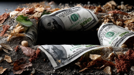 A captivating composition featuring crumpled cash surrounded by natural elements like leaves and soil, creating an intriguing contrast between finance and nature.