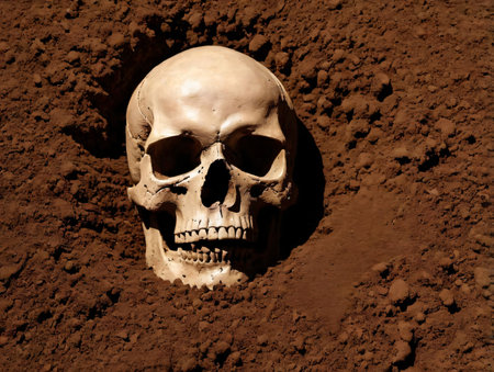 Human skull buried in soil dug up. Archeology concept.