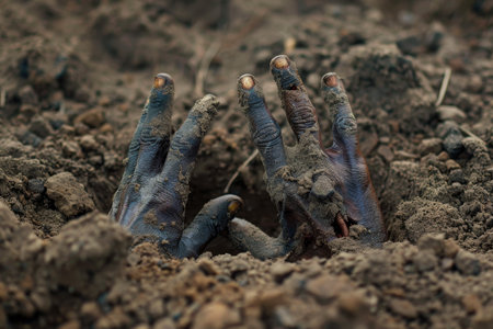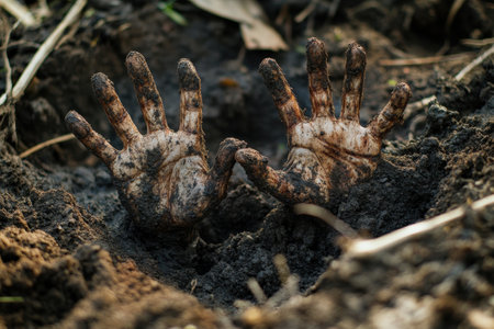 An up-close photograph capturing the detailed view of a persons hands immersed in the dirt, Petrifying zombie hands poking out of the ground, AI Generated
