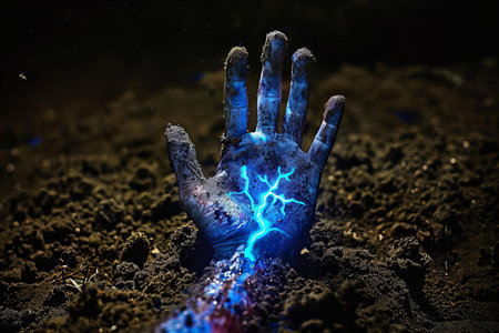 A zombie hand is rising from the ground, with a dark background and blue glowing on its palm, with a dirt texture.