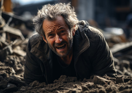 A man in a suit is in a muddy hole. He is looking down at the water and he is in a state of shock