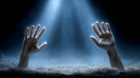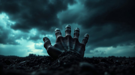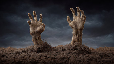 A haunting scene featuring zombie hands rising from the earth under a dark and stormy sky, capturing a chilling atmosphere perfect for horror-themed projects.