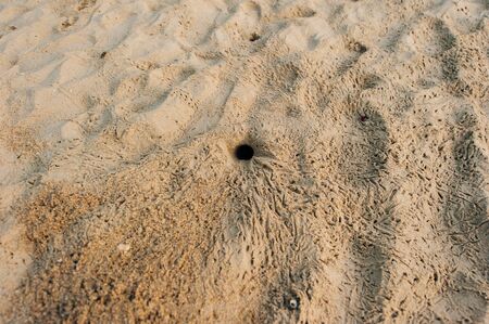 Fluffy crab's hole on white sand beach, Crabs holes on beach sand, Home of a Ghost crab.