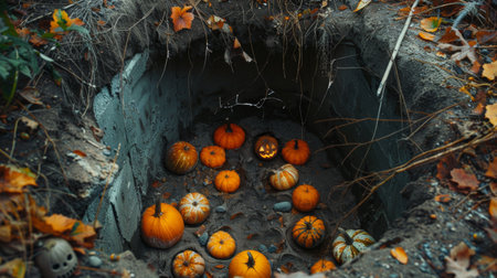 Various pumpkins, including a glowing Jack-o'-lantern, are arranged in a deep pit surrounded by autumn foliage, adding a spooky yet natural element to the Halloween scene.