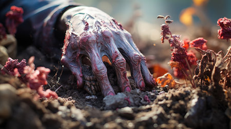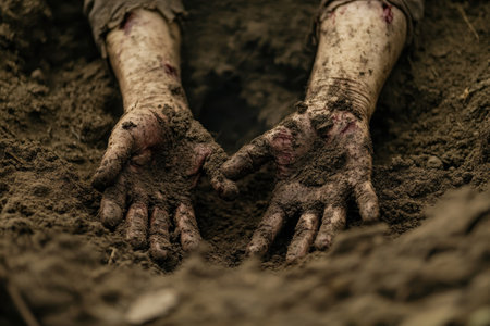 An up-close photograph capturing the detailed view of a persons hands immersed in the dirt, Petrifying zombie hands poking out of the ground, AI Generated