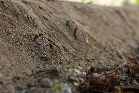 Cultivated ground in rural farm field. Freshly plowed earth. Organic compost mixed into farm soil. Fertile soil. Groundwork and soil for cultivation.