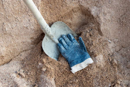 Scoop shovel smeared in concrete in a pile of sand for making concrete and a worker's glove