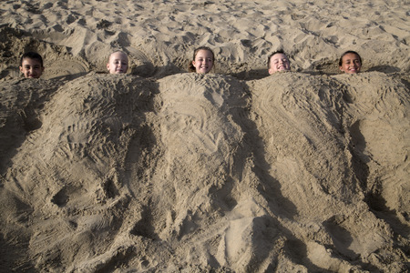 Family holiday in nature, children playing in the sand on the shore of the lake.