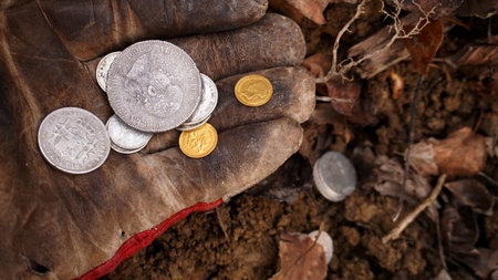Coins searching. Treasure hunting concept. In search of a lost treasure.