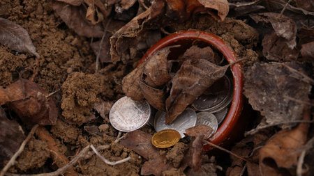 Gold coins on the ground in the forest. Selective focus.