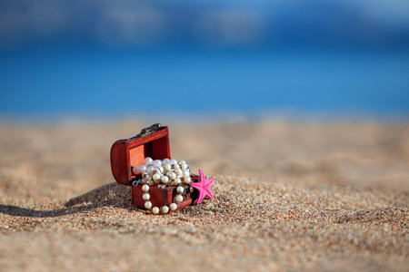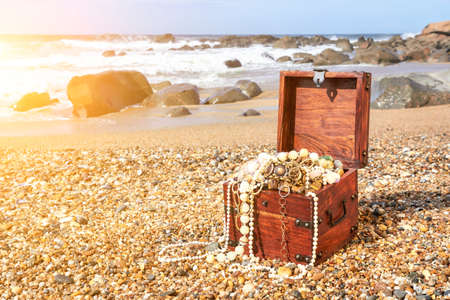 Decorative chest with jewelry on a beach