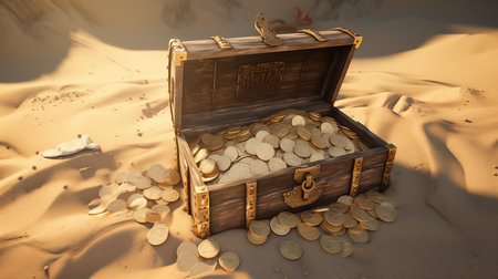 Open old case with gold coins buried in the dune sand fantasy background. Wealth concept.