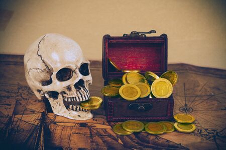 skull with gold coin in old box on old map.