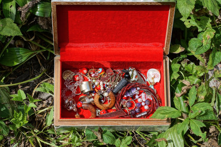 red open box with colorful jewelry stands among green grass and vegetation on the street