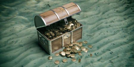 Treasure chest with gold underwater on the seabed. Old wooden trunk with open lid full of golden coins. 3d illustration