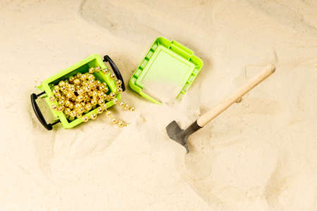 top view of an open container with golden spheres next to a shovel stuck in the sand. dug up a treasure, found treasures