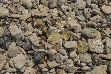 bitcoin Cryptocurrency. e-currency. sea. summer beach. sea stones. sea pebbles